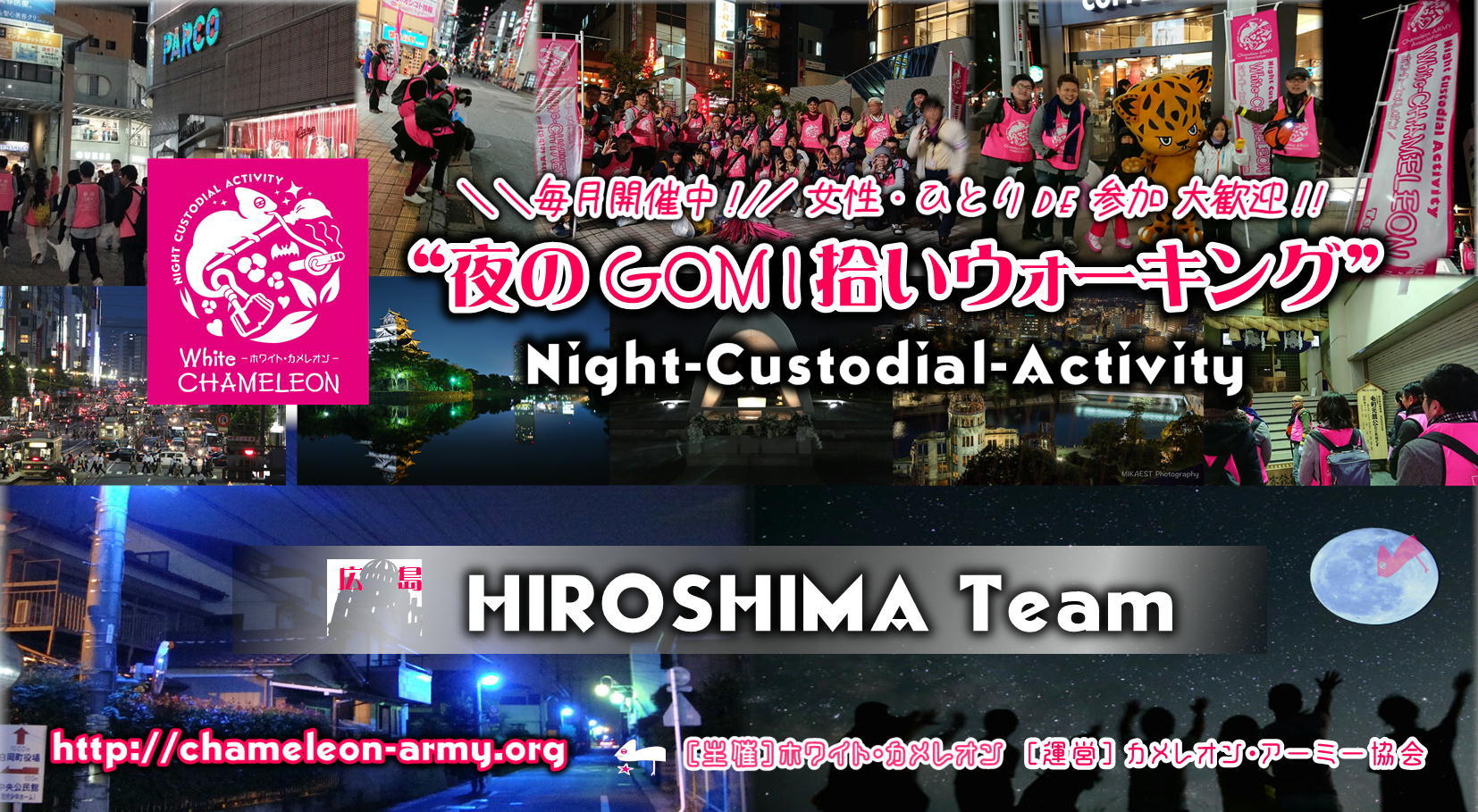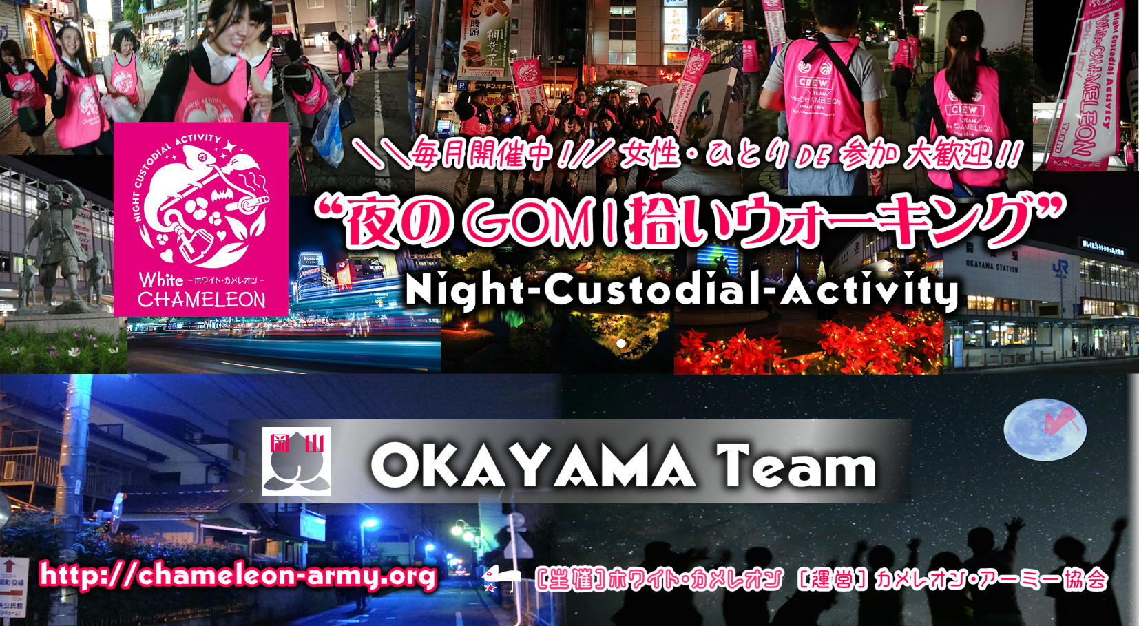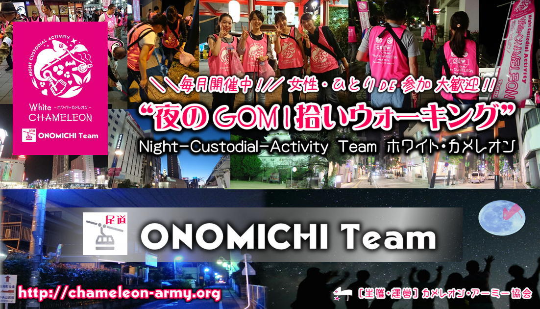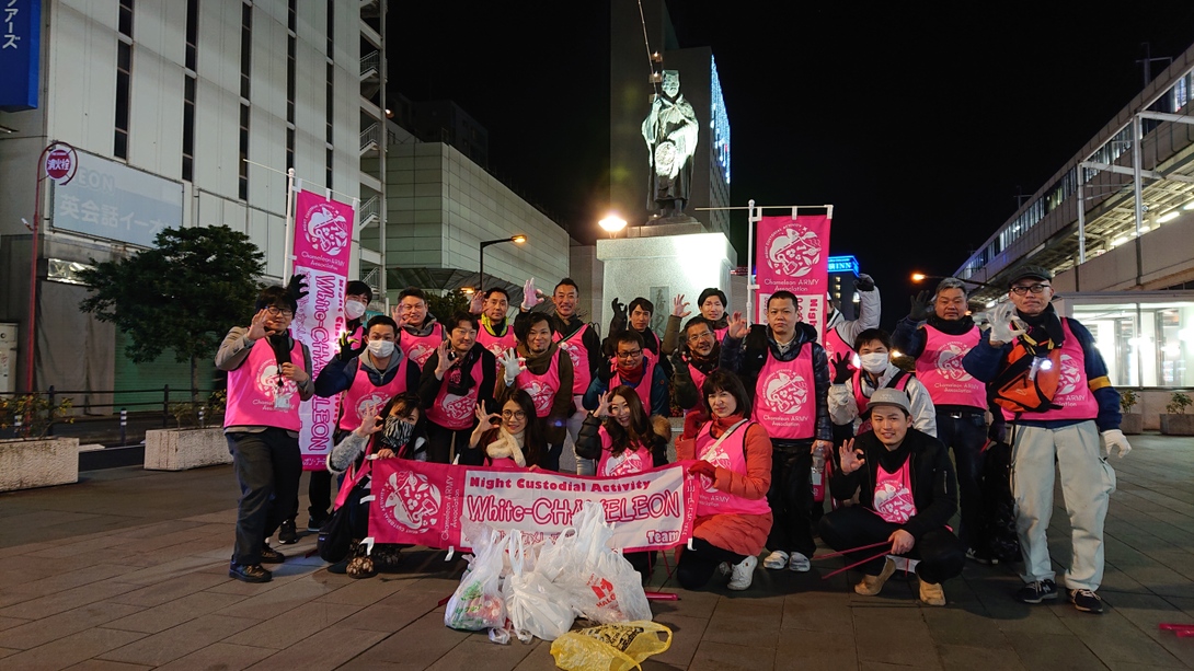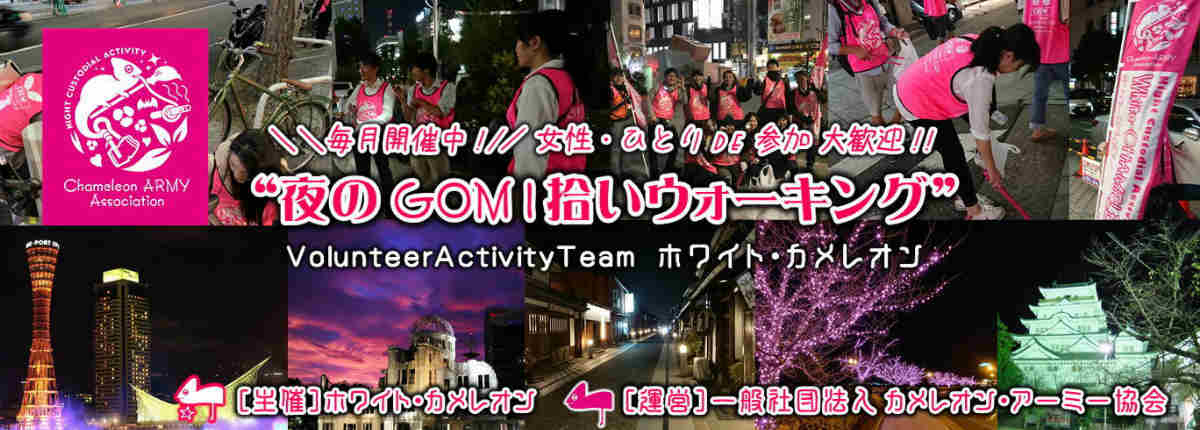 [ホワイト・カメレオン]の主な活動は“夜のGOMI拾いウォーキング”を各地域で定例で行い、その各リーダー会(チームリーダー/アシスタント)が主催・管理していきます。